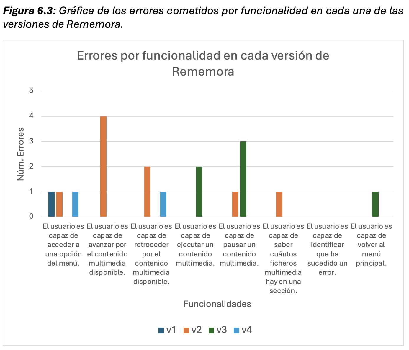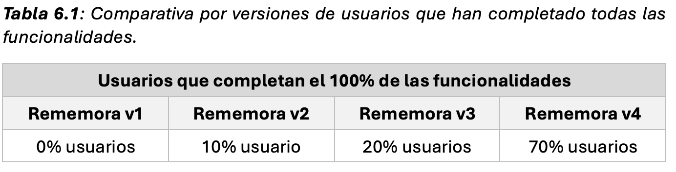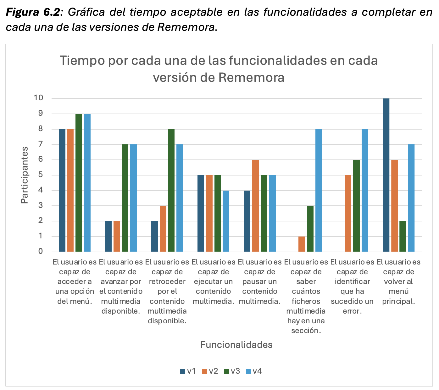 PACMAD indica en su artículo (Alzahrani et al., 2022) que una de las características para que una aplicación tenga una usabilidad aceptable debe tenerse en cuenta el número de funcionalidades que es capaz de completar el usuario. En Rememora v4 el usuario ha sido capaz de completar el 91% de las funcionalidades. Aunque sólo 2 funcionalidades han sido completadas por el 100% de los usuarios.