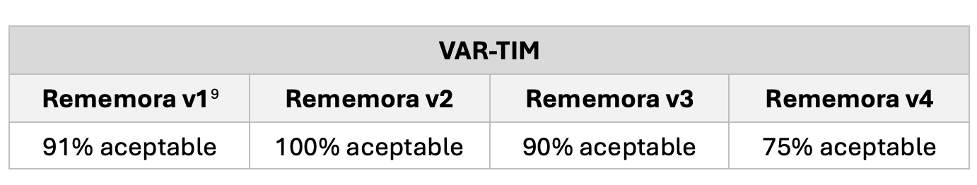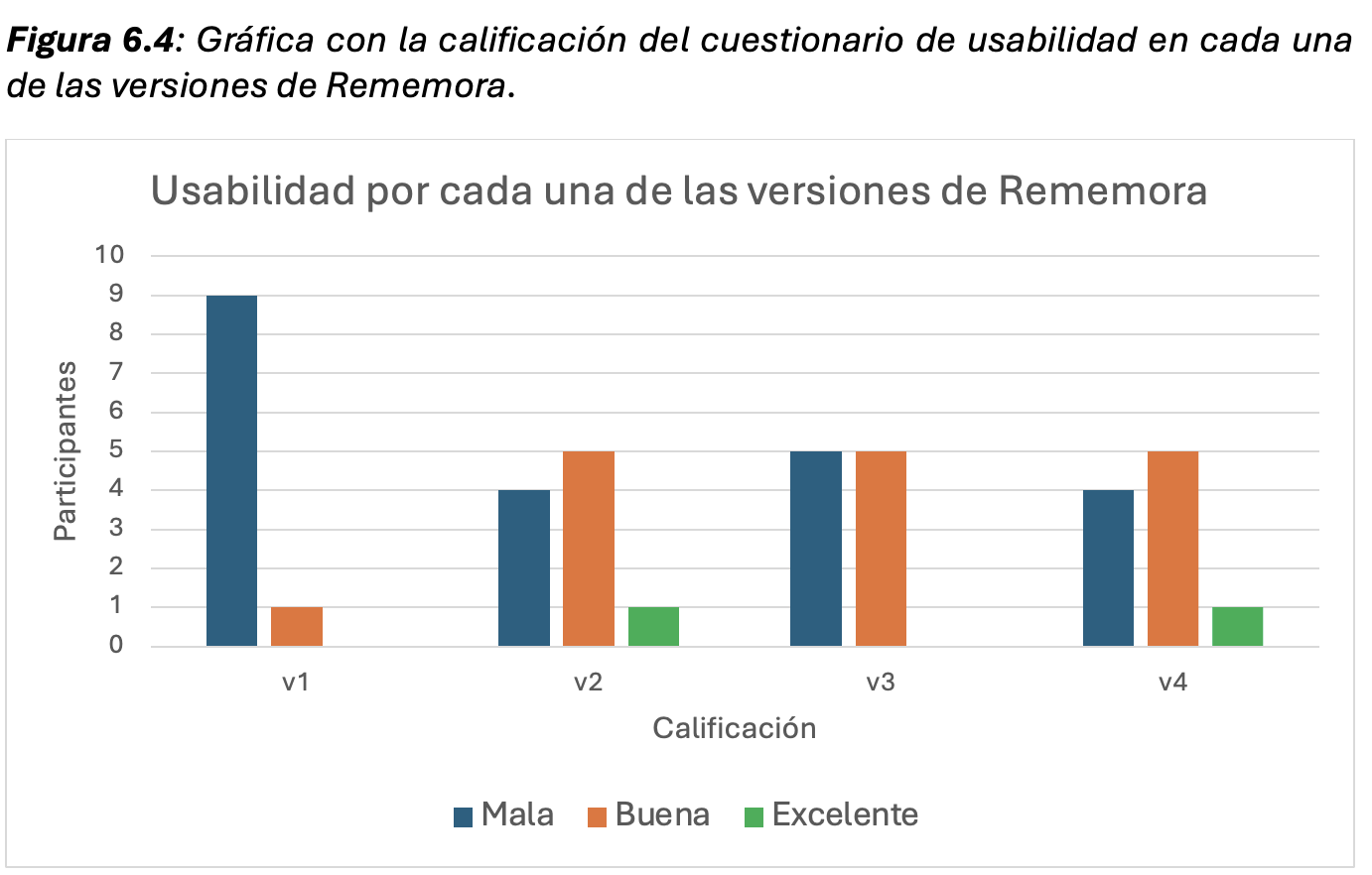 La mayoría de los participantes en cada una de las versiones de Rememora las ha valorado con una usabilidad positiva, aunque la puntuación media no llega al ‘aceptable’ según lo indicado en el cuestionario SUS.