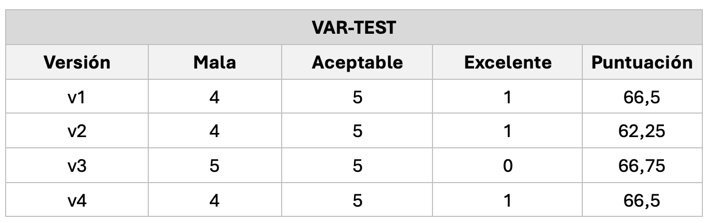 El cuestionario de usabilidad obtiene una puntuación que indica el grado de usabilidad de una aplicación según el test SUS. Al finalizar cada prueba y en cada versión, se ha pasado este cuestionario obteniendo las siguientes puntuaciones: