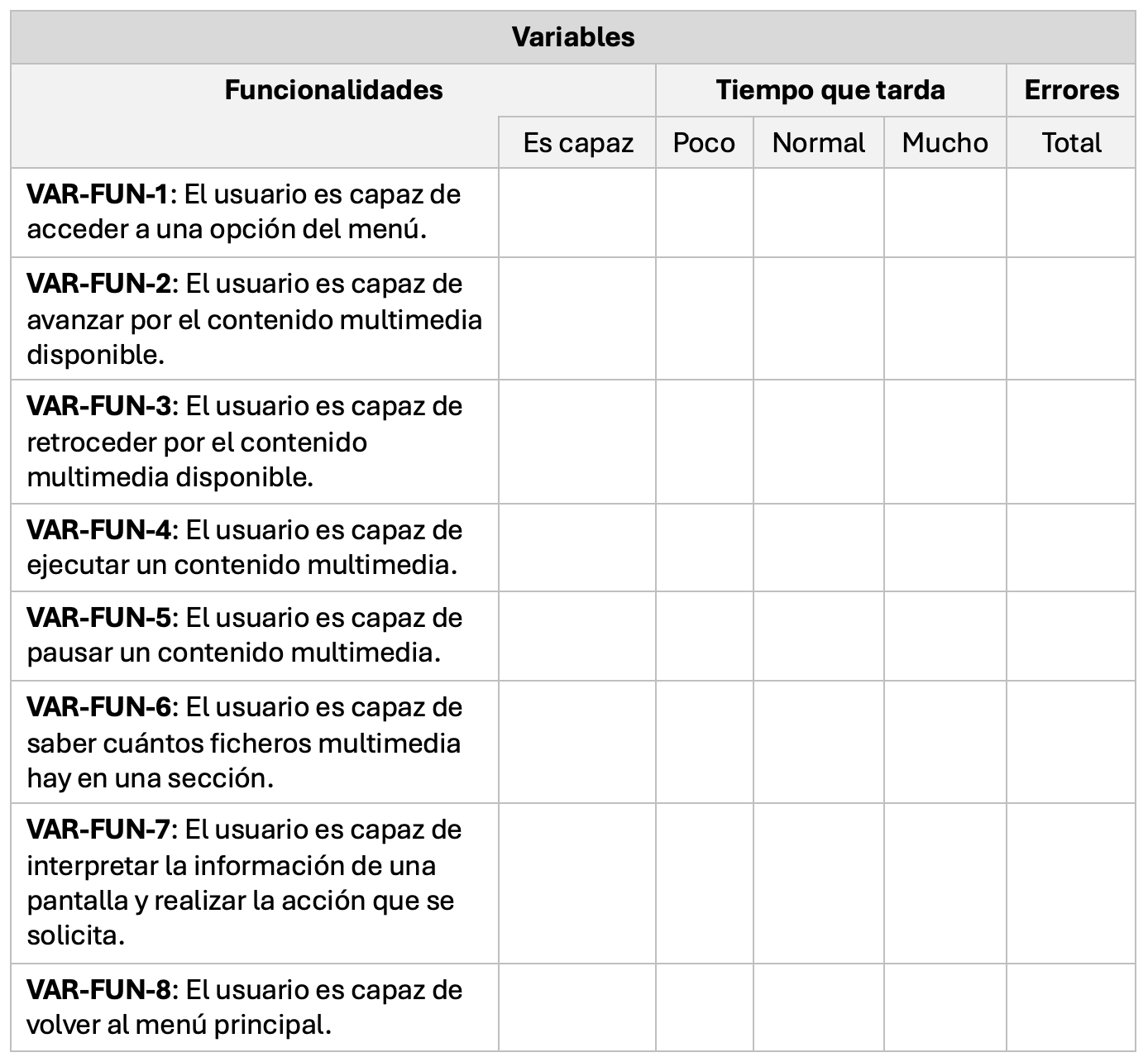 - Capacidad para ejecutar todas las funcionalidades de la aplicación (VAR-FUN): Esto se refiere a si los usuarios son capaces o no de utilizar todas las funciones disponibles en la aplicación. Se evalúa de manera binaria (sí/no). Dentro de este grupo se ha subdividido por cada una de las funcionalidades que tiene la aplicación y se ha etiquetado como VAR-FUN-X donde X es un número único por cada funcionalidad detectada.