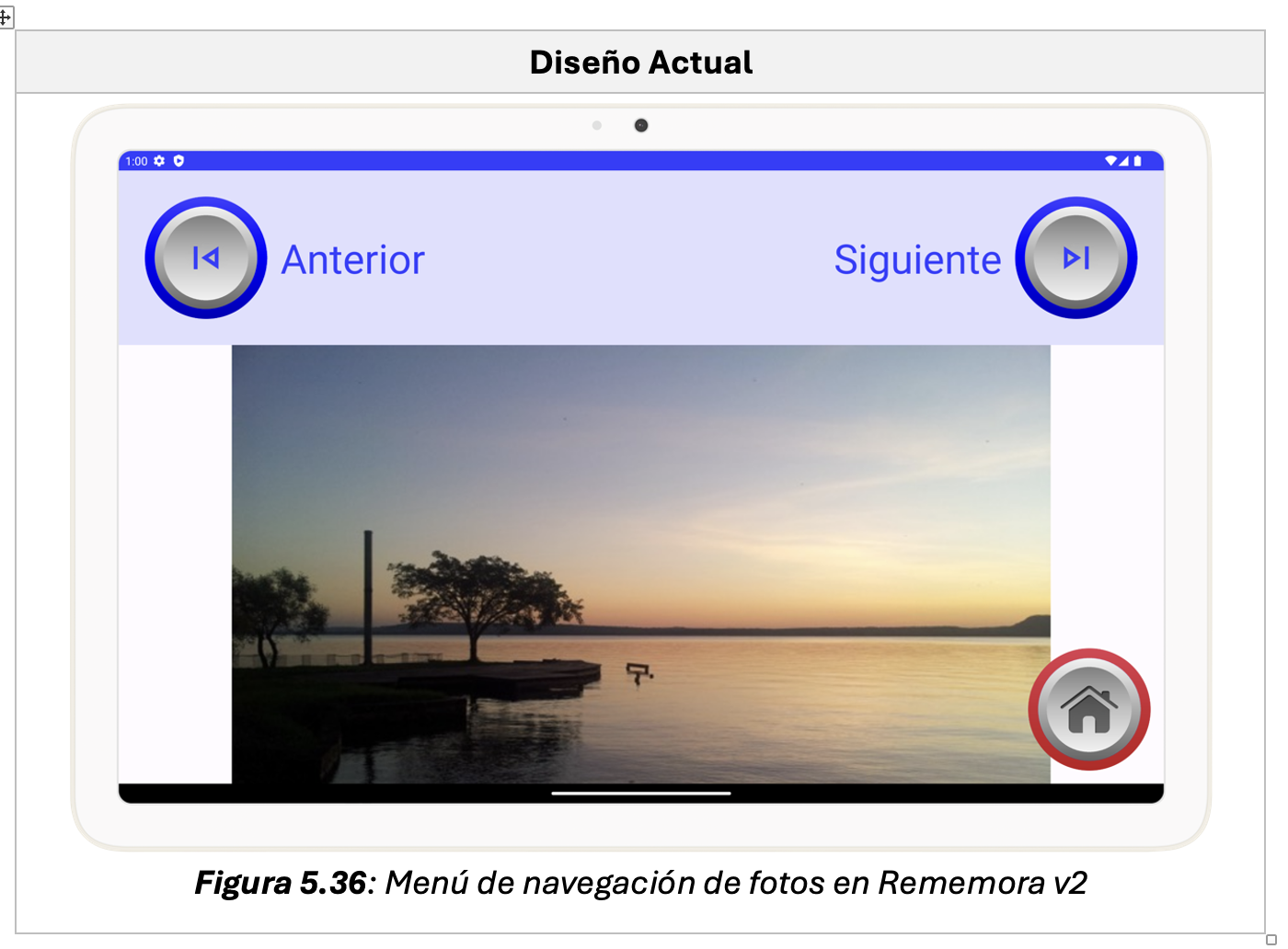 Para diseñar una interfaz amigable para usuarios mayores de 70 años, especialmente en una aplicación para tabletas que incluye navegación entre dos pantallas principales, es crucial considerar la accesibilidad, la visibilidad y la facilidad de uso. A continuación, se detalla una solución visual para implementar una opción que permita a los usuarios volver desde la segunda pantalla (donde se muestra el carrusel de fotografías) a la primera pantalla (menú principal):
