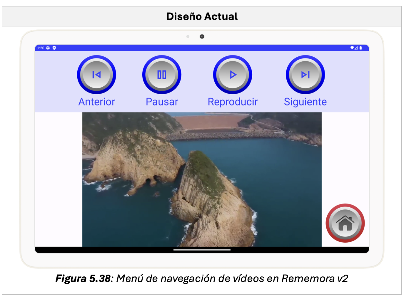 Actúa como un experto en diseño de interfaces y experiencia de usuario. En una aplicación para tablet existe una pantalla que muestra un reproductor de vídeos. Esta pantalla muestra en la parte superior un menú de navegación centrado con cuatro acciones. La primera acción sirve para ir al anterior vídeo y tiene el texto asociado: “Anterior”. La segunda opción permite pausar el vídeo y tiene el texto asociado: “Pausar”. La tercera opción permite reproducir el vídeo y tiene el texto asociado: “Reproducir”. La cuarta opción permite pasar al siguiente vídeo y tiene el texto asociado: “Siguiente”. Debajo de este menú de navegación se encuentra la zona donde se reproduce el vídeo.