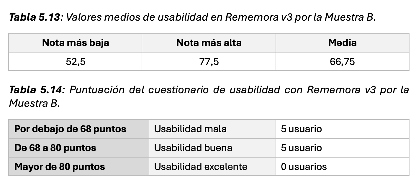 Según los datos reflejados en la tabla de resultados del cuestionario (SUS) la versión inicial o Rememora v3 el 10% de la Muestra B ha valorado positivamente la usabilidad de la aplicación y un 90% la ha valorado con una usabilidad negativa.