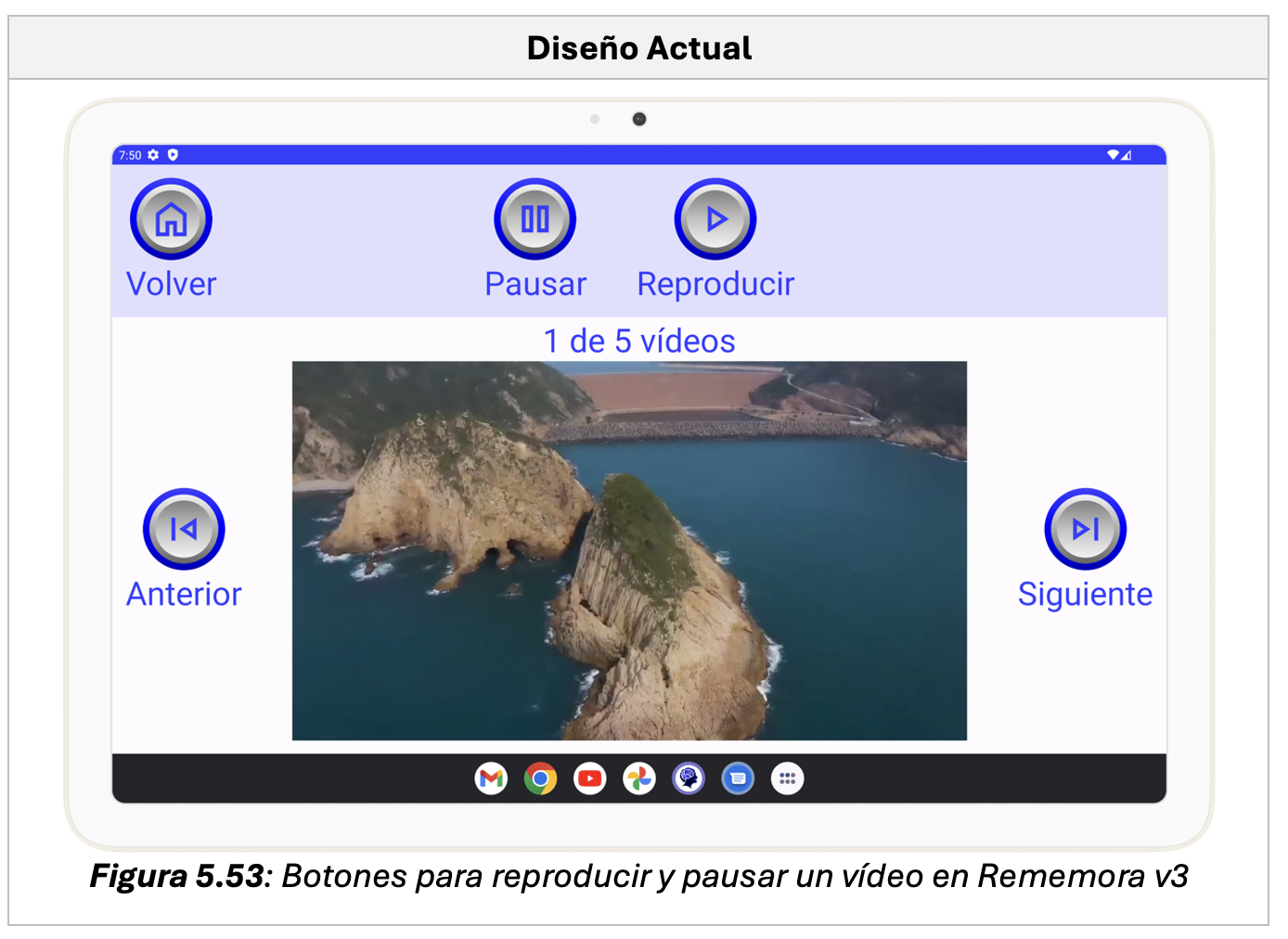 Actúa como un experto en diseño de interfaces y experiencia de usuario. La aplicación que se está desarrollando tiene una pantalla con un reproductor de vídeos. Esta pantalla tiene en la parte superior izquierda un botón para volver al menú principal (otra pantalla distinta). En la parte superior hay dos botones centrados que actúan directamente sobre el vídeo: reproducir vídeo con la etiqueta “Reproducir” y pausar vídeo con la etiqueta “Pausar”. En el lado izquierdo del reproductor hay un botón para volver a reproducir el anterior vídeo con la etiqueta “Anterior” y en el lado derecho hay un botón para pasar el siguiente vídeo con la etiqueta “Siguiente”. Estos cuatro botones: Reproducir, pausar, anterior y siguiente forman parte de lo que denominamos “Menú de Navegación”.