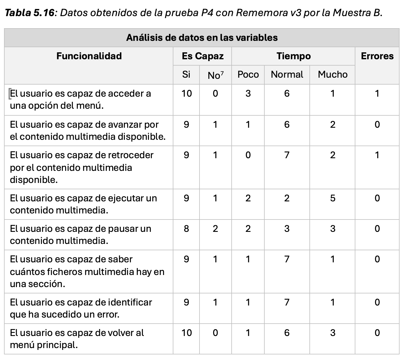 Tras el análisis de la prueba P5 entre Rememora v3 y v4 con la Muestra B se sacan las siguientes conclusiones: